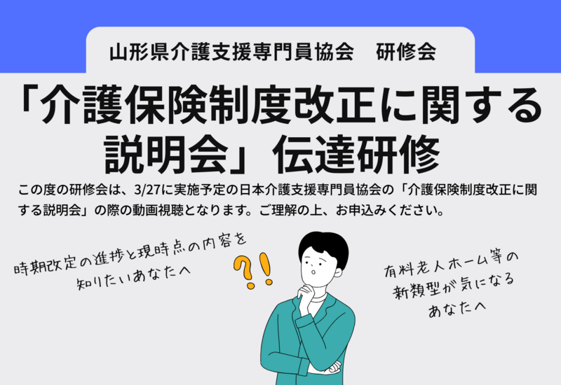 この度、一般社団法人日本介護支援専門員協会で令和8年3月27日に開催される「介護保険制度改正に関する説明会」の伝達研修を行うこととなりました。